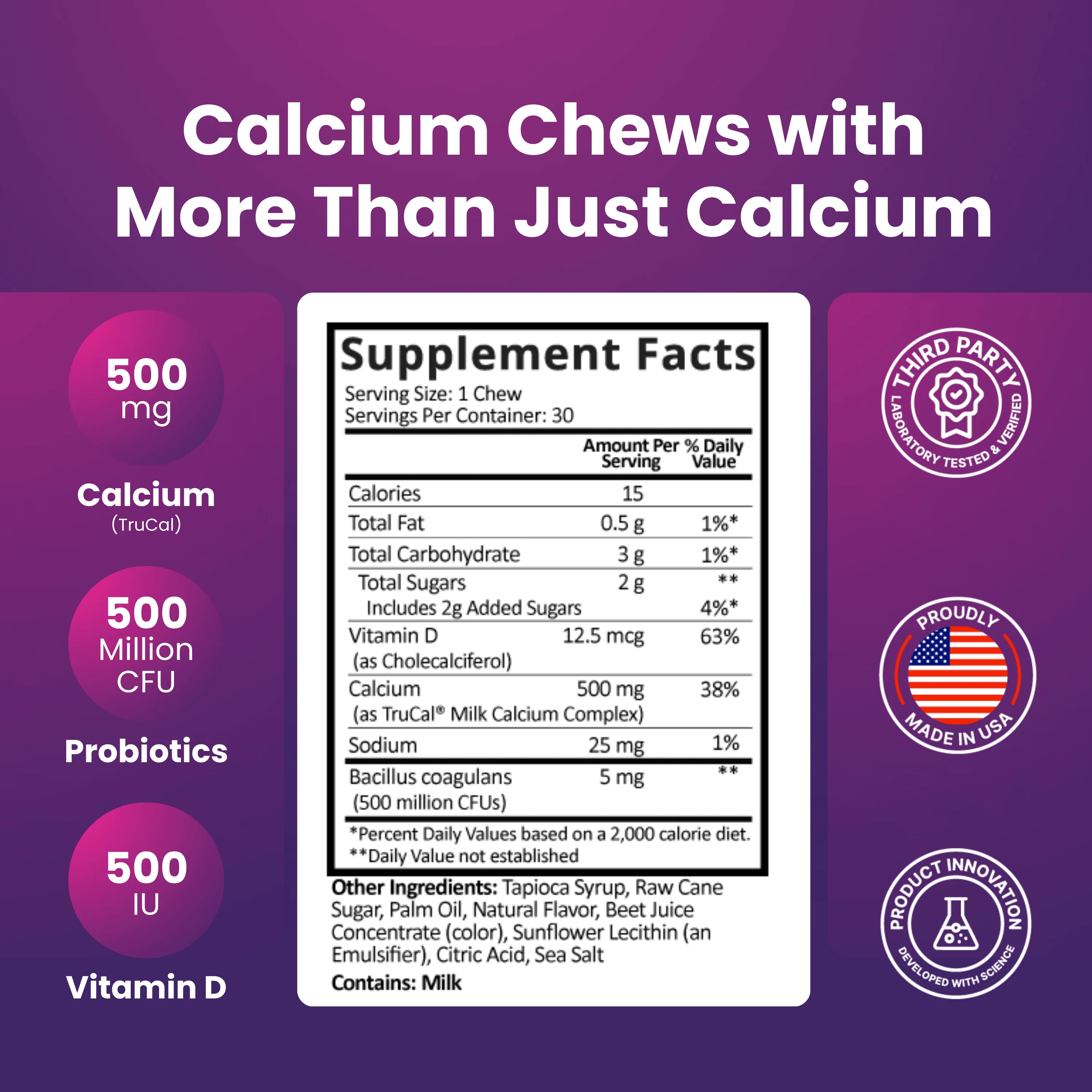 Our Strawberry Swirl Calcium Soft Chews contain TruCal®—a naturally sourced, lactose-free calcium—and include added Vitamin D3 (500 IU) to support calcium absorption and help maintain bone structure. We also include 500 million CFU of probiotics to support digestive balance and nutrient utilization.*